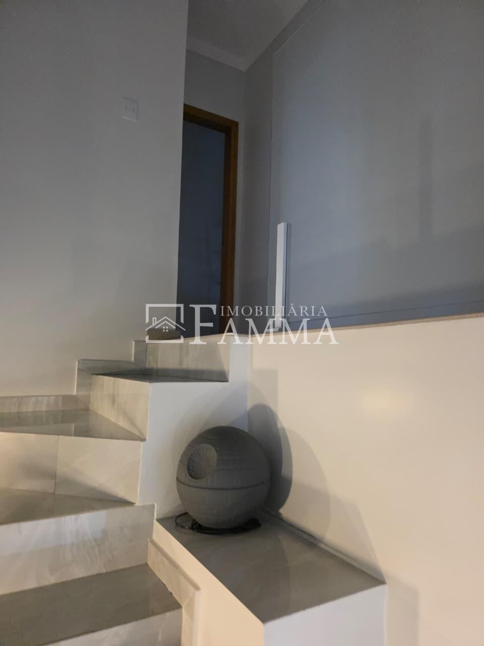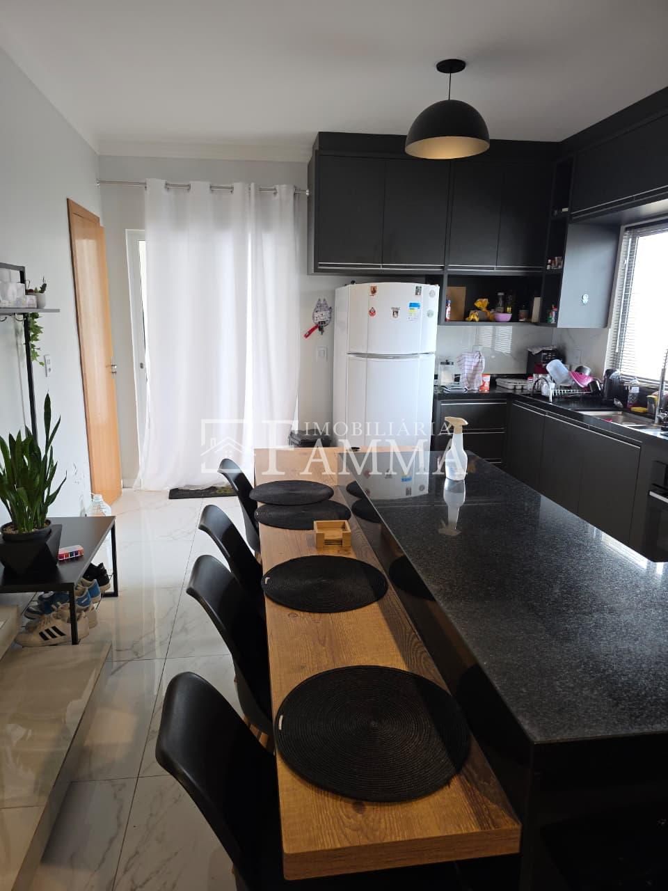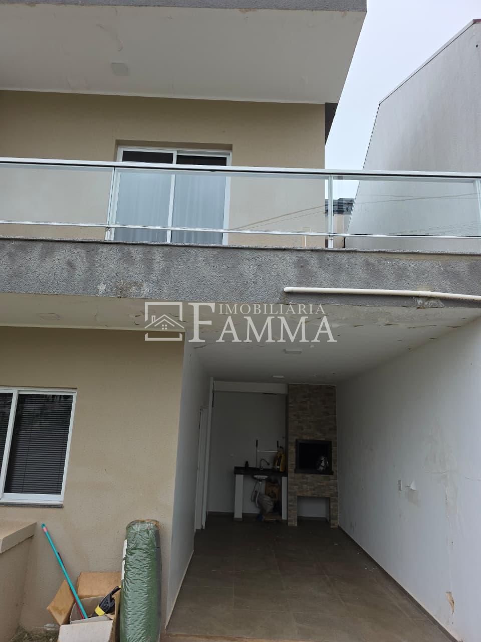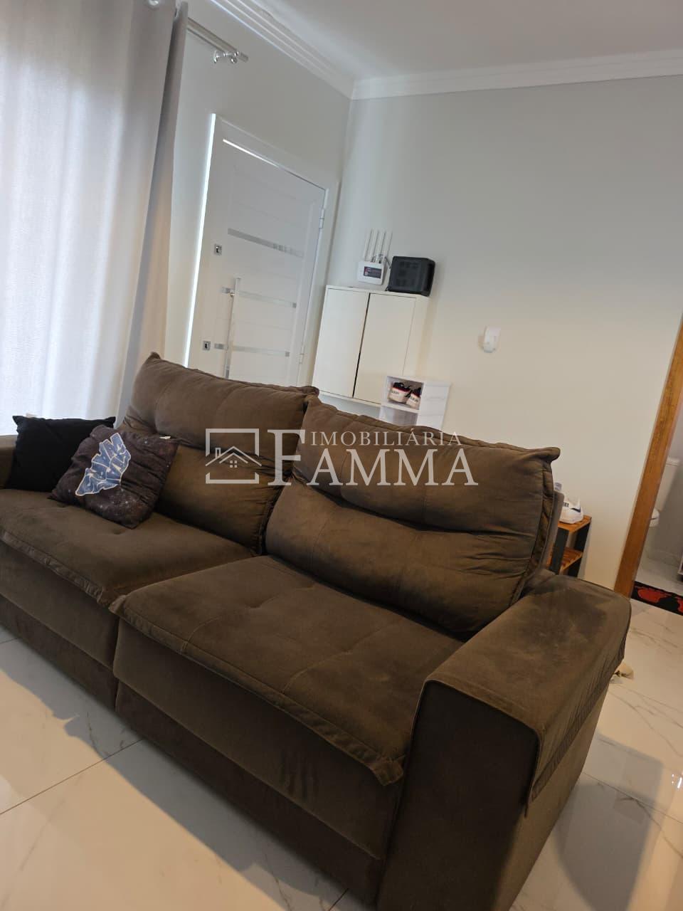 IMOBILIÁRIA FAMMA VENDE: Sobrado contendo: área construída de 124,47m² e terreno de 157,39m², composto pelas seguintes peças: Pavimento térreo: Sala, Cozinha, Lavanderia, 01 Vaga de garagem coberta, bancada churrasqueira, muros em torno, e portão eletrônico. Pavimento Superior: 03 dormitórios, sendo 01 suíte com sacada mais 02 quartos com sacada e 01 banheiro social OBS: Permanecem no imóvel todos os móveis fixos.