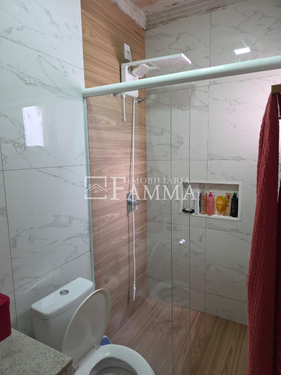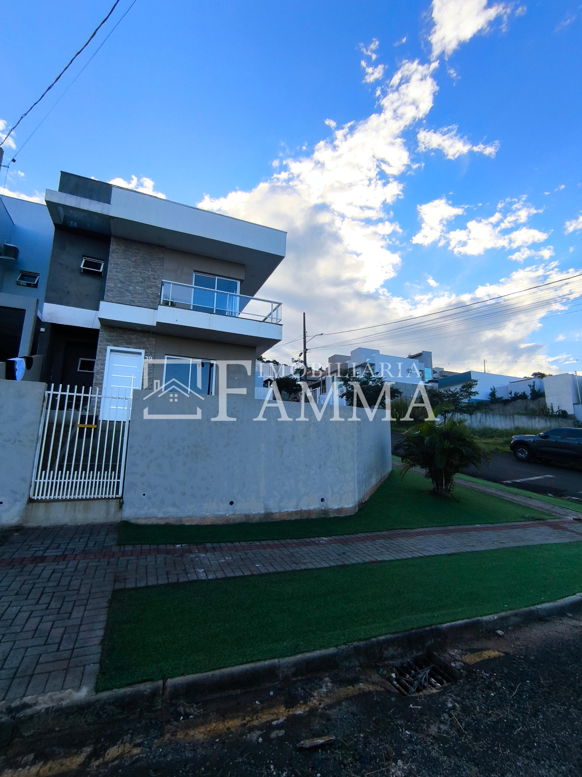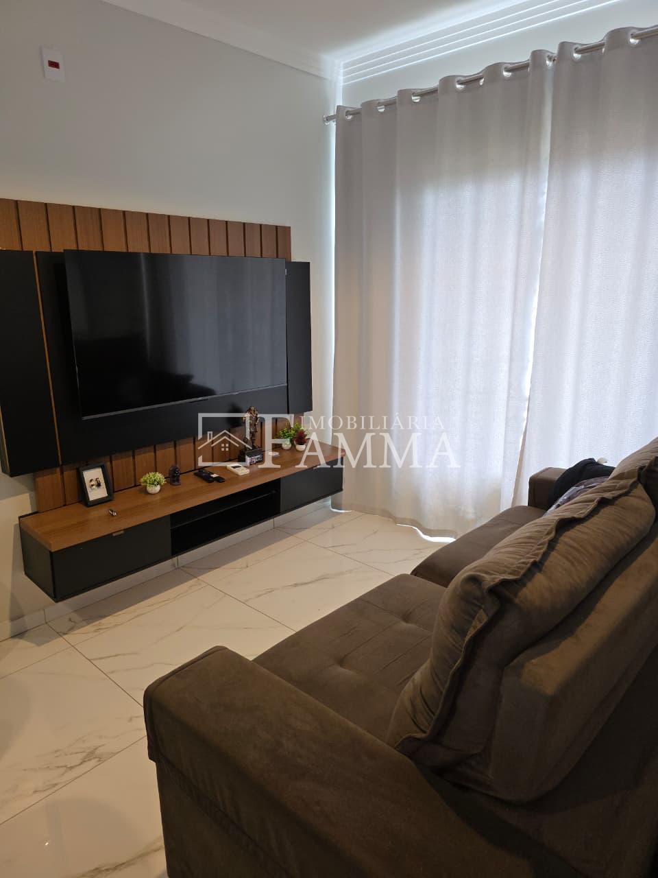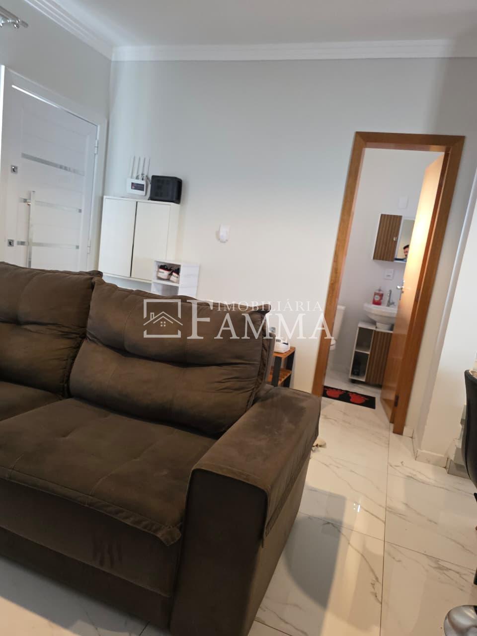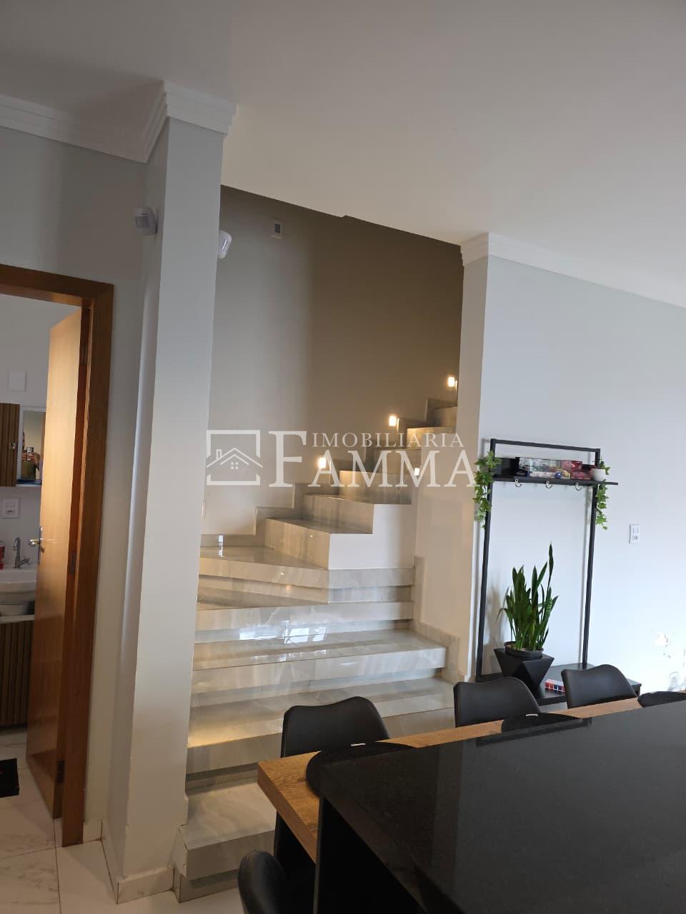 IMOBILIÁRIA FAMMA VENDE: Sobrado contendo: área construída de 124,47m² e terreno de 157,39m², composto pelas seguintes peças: Pavimento térreo: Sala, Cozinha, Lavanderia, 01 Vaga de garagem coberta, bancada churrasqueira, muros em torno, e portão eletrônico. Pavimento Superior: 03 dormitórios, sendo 01 suíte com sacada mais 02 quartos com sacada e 01 banheiro social OBS: Permanecem no imóvel todos os móveis fixos.